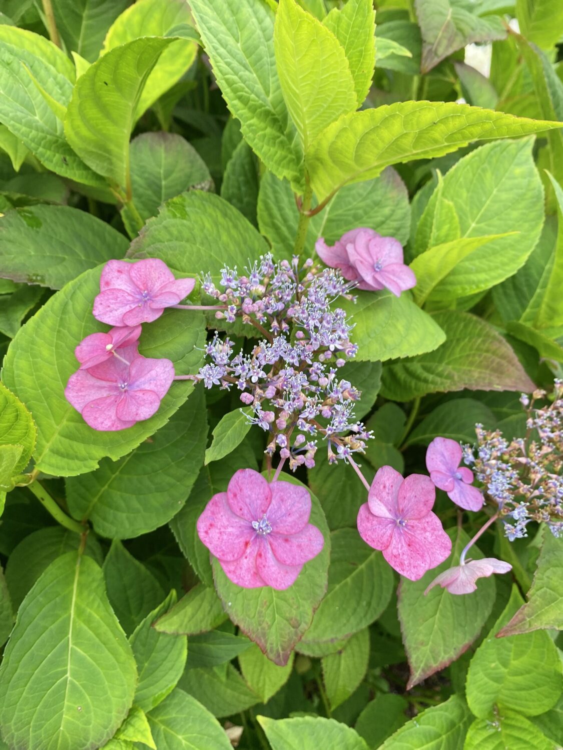 Jos žiedynai sudaryti iš mažyčių šviesiai violetinės spalvos žiedelių viduje ir didesnių, sterilių baltos spalvos žiedų išorėje. Spalvotų žiedelių kvapas ir nektaras pritraukia daug vabzdžių – todėl praktiškai visose nuotraukose puikuojasi drugiai, kurių Botanikos sode šiemet netrūksta. Žali, sultingi šios hortenzijos lapai padengti šiurkščiais plaukeliais, nuo kurių ir kilo rūšies pavadinimas.