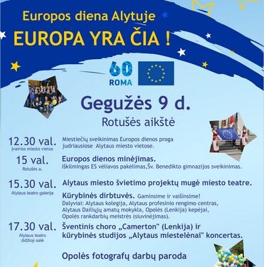 Sveikinimas miestelėnams, Alytaus miesto švietimo projektų mugė, kūrybinės dirbtuvės, gardžios vaišės ir koncertas – tai numatyta šių metų Europos dienos minėjimo programoje, kurią tradiciškai minėsime gegužės 9 d.