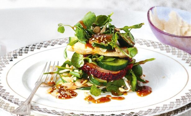 Lėkštėje išdėliokite salotas, pusžiedžiais pjaustytą agurką, anties krūtinėlę – plonais griežinėliais. Ant viršaus užberkite sausoje keptuvėje paskrudintus ir smulkintus graikinius riešutus. Padažui išvardintus ingridientus išmaišykite dubenėlyje ir apipilkite salotas.