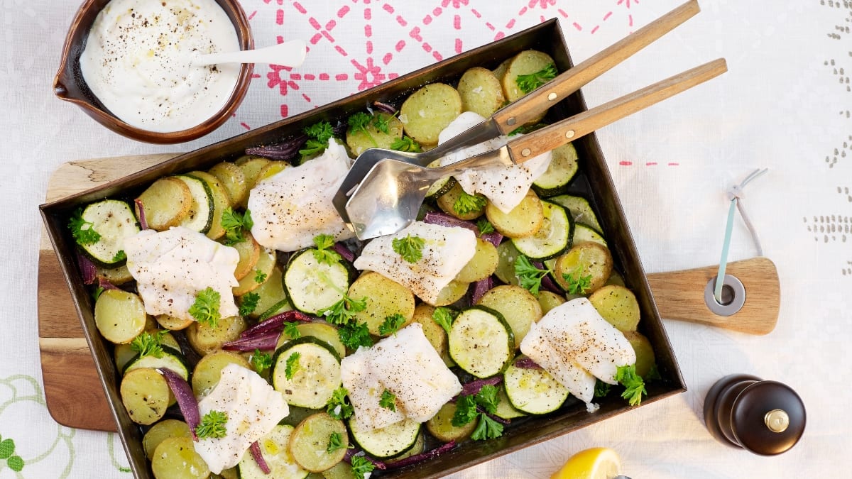 Jeigu naudosite šaldytą žuvį, ją atitirpinkite. Įkaitinkite orkaitę iki 225 °C. Nuskuskite ir supjaustykite bulves apie 0,5 cm storio riekelėmis, o cukiniją 1 cm storio riekelėmis. Nulupkite ir supjaustykite svogūną žiedais. Sudėkite daržoves ant skardos ir apšlakstykite aliejumi bei pabarstykite druska ir pipirais. Kepkite orkaitėje apie 25 min.