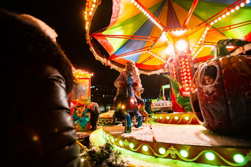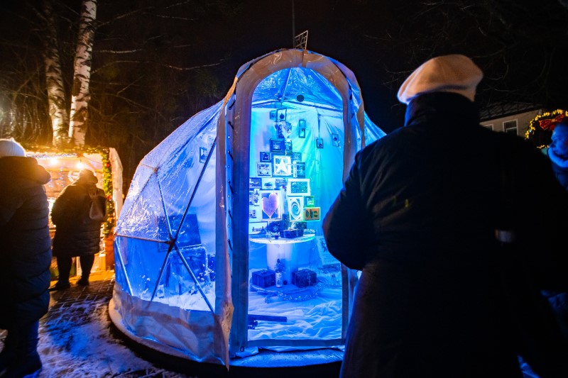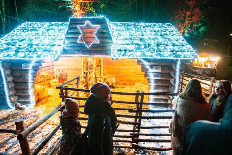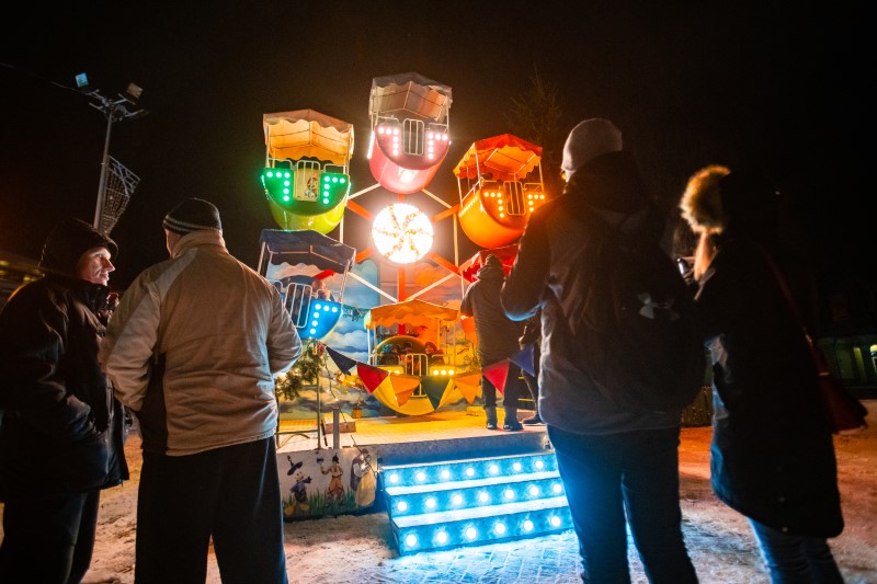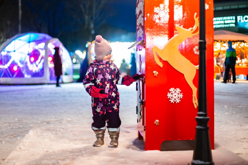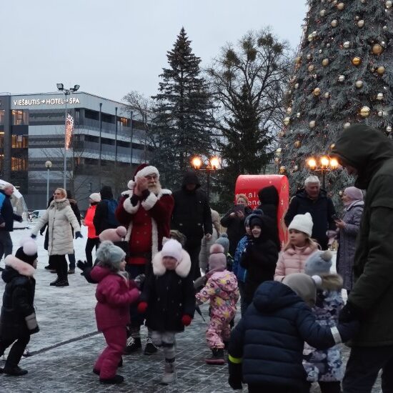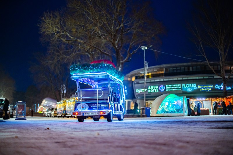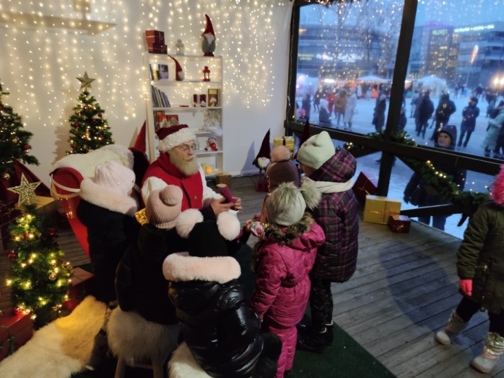 Aikštėje įsikūrusiame kalėdiniame miestelyje savaitgaliai verda pilnas garsų, kvapų, kalbų, dovanų ir paslapčių gyvenimas. Čia sukasi linksmos karuselės, važinėja spalvingas traukinukas, veikia kalėdinis paštas, savo vienintelėmis Lietuvoje elektrinėmis rogėmis – kalėdomobiliu – leidžia pasivažinėti Senelis Kalėda, tuo metu savo rezidencijoje žaidžiantis, išdykaujantis, plepantis ir, žinoma, besifotografuojantis su savo mažaisiais draugais.