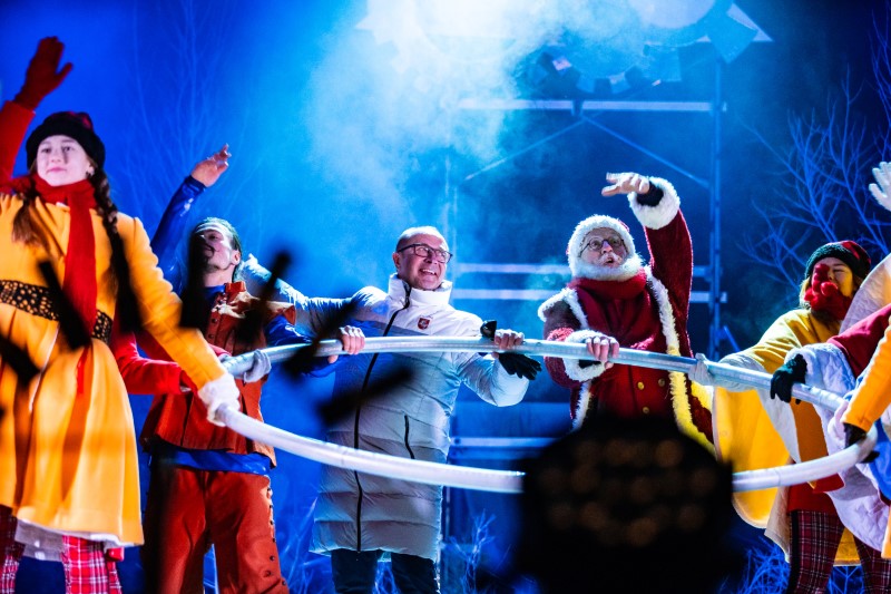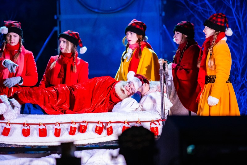 Eglės įžiebimo šventėje kalėdinę pasaką kūrė Senelis Kalėda (aktorius Petras Lisauskas), mažieji gnomai (šiuolaikinio šokio studija „Opus“) ir Laiko magistras, kurio įspūdingą kovą su maištaujančiu senuoju laikrodžiu įkūnijo ypatingas svečias – šiuolaikinio cirko atlikėjas iš Latvijos Aleksey Smolov, taip įsukęs žibantį Cyro ratą, kad pasklidusios žiežirbos įžiebę eglę. Lengvai nubalusi, padabinta karūna ir auksiniais burbulais Druskininkų eglė apsirėdė švytinčiais lazerių brangakmeniais ir atskleidė savo stulbinantį grožį!
