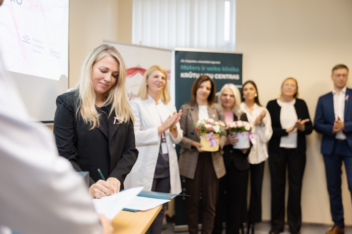 KUL generalinis direktorius prof. dr. Audrius Šimaitis dėkojo D. Nausėdienei už parodytą dėmesį, Tarptautinei Vilniaus moterų asociacijai už iniciatyvą „Sužydėjusi viltis“, ilgametį bendradarbiavimą ir prasmingą indėlį gerinant krūties vėžiu sergančių moterų diagnostiką bei gydymą Vakarų Lietuvoje.