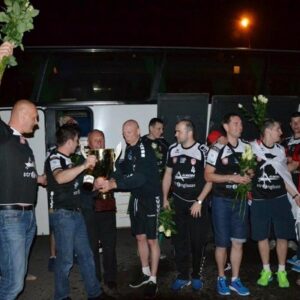 Alytaus vyrų rankinio komanda, iškovojusi Lietuvos rankinio lygos čempionato auksą, šiąnakt buvo sutikta prie Alytaus sporto ir rekreacijos centro. Sirgaliai skandavo „ačiū“.