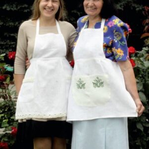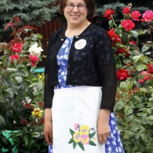 Dalyvauti respublikinėje tradicinio siuvinėjimo stovykloje „Žaliasis laumžirgis“ buvo didžiausia Aleksandros Stasytienės iš Utenos svajonė. Tiesa, siuvinėjimas nėra didelė jos aistra: Aleksandra – sertifikuotų tautinio paveldo produktų amatininkė, verčiasi senaisiais amatais – augalininkyste, žolininkyste, gamtos gėrybių rinkimu, maisto gaminimu. Ji domisi ir audimu, rengia edukacines pamokas, kuriose pristato vieną iš katalikų sakramentalijų – škaplierių. A. Stasytienė savo prijuostę išpuošė peltakių juostelėmis, virvele ir pilnaviduriu siuvinėjimu mėlynai išsiuvinėjo gėlių žiedus.