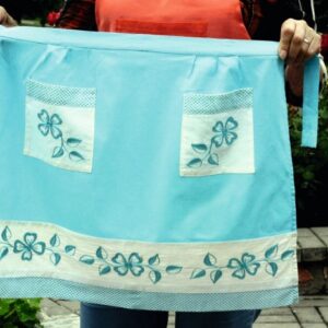 „Ši spalva būdinga mano kraštui: mėlynais motyvais buvo puošiamos staltiesės, virtuvės užuolaidėlės, rankšluostėliai, maišeliai, prijuostės. Peltakiai sudaro krepšelį. Taigi mano prijuostėje – pintas krepšelis su gėlėmis“, – šypsosi Aleksandra.